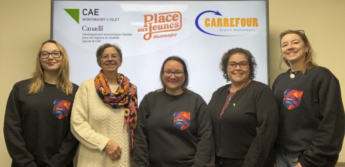 Sur la photo, de gauche à droite : Frédérique Petitclerc agente de migration Place aux jeunes MRC de Montmagny, Mireille Thibault directrice générale CAE Montmagny-L’Islet, Caroline Gimbert directrice générale Carrefour Région Montmagny, Christine Talbot conseillère en communication et développement local CAE Montmagny-L’Islet et Annik Lachance agente de projet Carrefour Région Montmagny.