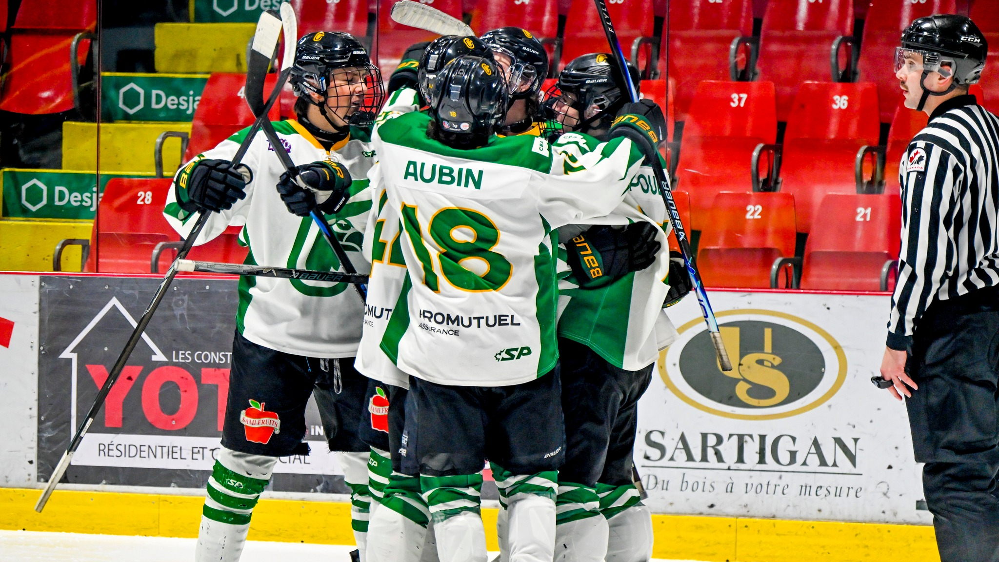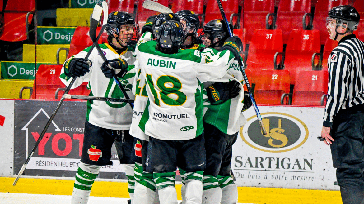 Samedi, à Montréal, Justin Breton a dirigé l’attaque avec trois passes, alors que Justin Bouchard a lui aussi récolté trois mentions d’aide. Cinq marqueurs différents ont contribué : Charles-Albert Pouliot (9), Yan Rivière (12), Thomas Aubin (7), Tristan Giroux (1), ainsi que Mathys Lapointe (8), qui a confirmé la victoire dans un filet désert. Devant le filet, Ryan Gagné a été solide avec 28 arrêts, signant du même coup sa sixième victoire de la saison.