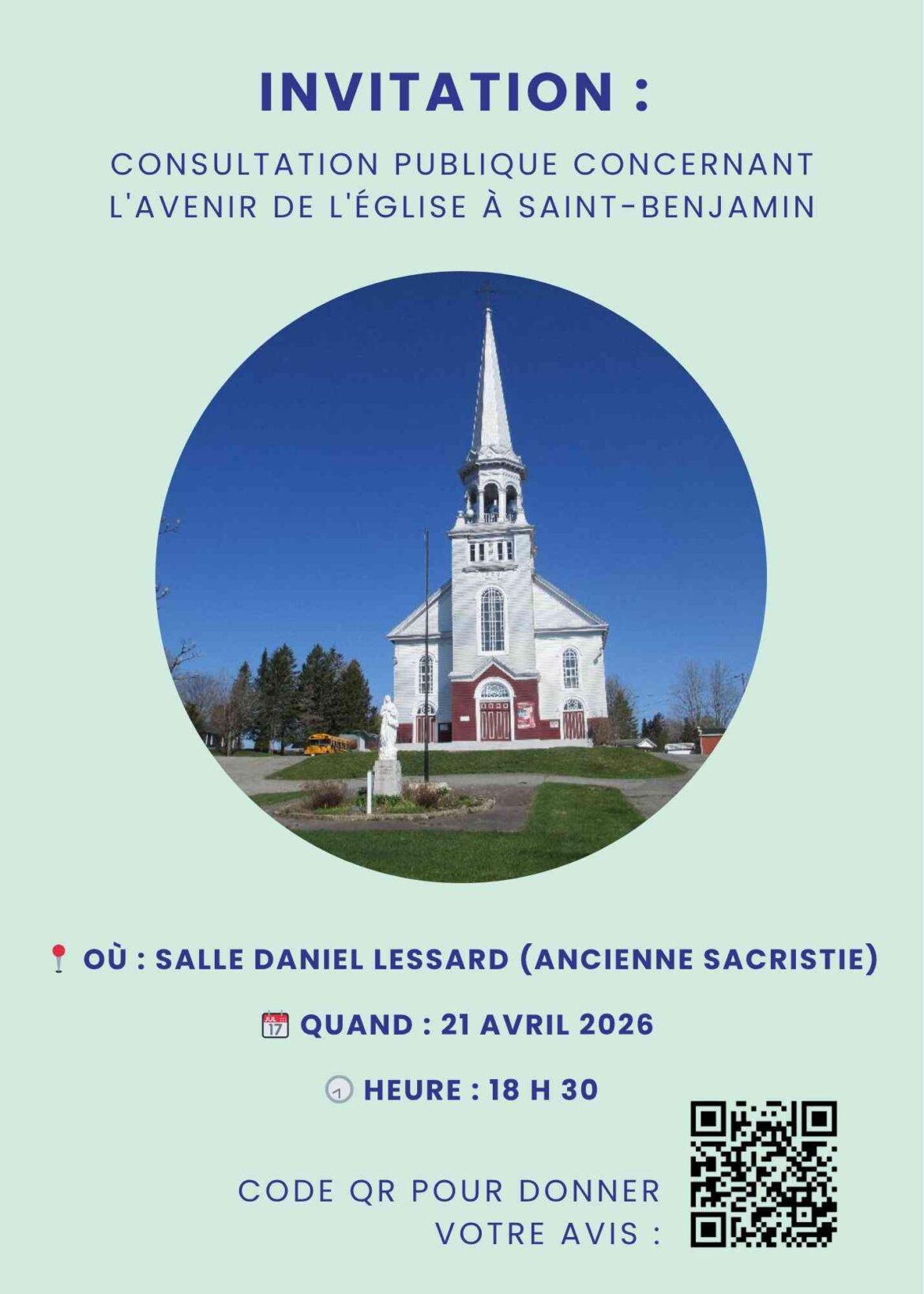 Les citoyennes et citoyens de Saint-Benjamin sont invités à participer à une consultation publique sur l’avenir de son église.