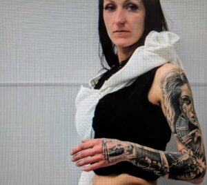 Elle porte de nombreux tatouages au bras gauche dont le visage d’une femme avec un doigt sur les lèvres, horloge avec chiffres romains, grenade près du coude, poing américain à l’avant-bras, carte à jouer avec image de « Joker » ou Harlequin sur la main.